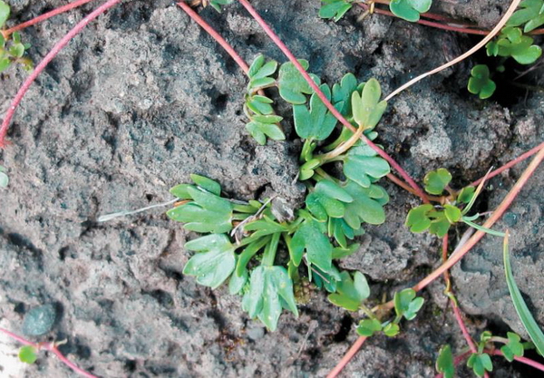 多年生小草本。匍匐茎纤细,横走,节处生根和簇生数叶。叶均基生; 叶片质地较厚,形状多变异,菱状楔形至宽卵形,长1-2cm,宽0.5-1cm,基部楔形至截圆形,3中裂至3深裂,有时侧裂片2-3裂或有齿,中裂片较长,长圆形,全缘,脉不明显,无毛或有柔毛;叶柄长1-2cm,基部有膜质鞘。花葶高2-4cm或更高,无毛或有柔毛,无叶或有1苞片;花单生,直径7-10mm;萼片卵状长圆形,长3-5mm,边缘膜质;花瓣5,黄色或表面白色,狭椭圆形,长约5mm,宽1.5-2mm,顶端稍尖,有3-5脉,爪长约0.8mm,蜜槽点状或上部分离成极小鳞片;雄蕊约20,花药卵圆形,长0.5-0.8mm,花丝长为花药的2-3倍;花托有短毛。聚合果近球形,直径约6mm;瘦果20多枚,斜倒卵形,长1.2-2mm,宽约1mm,两面稍膨起,有3-7条纵肋,无毛,喙长约0.5mm。花果期5-8月。