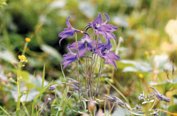 茎高10-55cm,自下部或中部分枝,稀不分枝,被反曲的短柔毛。基部叶在开花时多枯萎。下部叶具长柄;叶片圆五角形,长1-2.8cm,宽2.5-5cm,3全裂,中全裂片一回3裂或常二至三回近羽状细裂,小裂片稀疏,狭披针形至线形,两面疏被短柔毛;叶柄长3.5-7.5cm,基部近无鞘。伞房花序有2-6花;基部苞片叶状,上部的3裂或不分裂而呈钻形;花梗长4.5- 9cm,密被反曲或开展的短柔毛,并混有黄色腺毛;小苞片生花梗中部上下,线形或钻形,长3-7mm;萼片宿存,蓝紫色,卵形,长1.6-2.4cm,外面有白色柔毛,内面无毛,距钻形,长2.1-2.4cm,上部粗约3mm,末端向下弯曲;花瓣无毛,顶端微凹;退化雄蕊的瓣片黑褐色,长6-9mm,2裂达中部,腹面被黄色髯毛,爪与瓣片近等长;雄蕊无毛;心皮5,子房密被柔毛。蓇葖长约1.8cm;种子倒圆锥状四面体形,长约1mm,沿棱近无翅。花期7-8月。