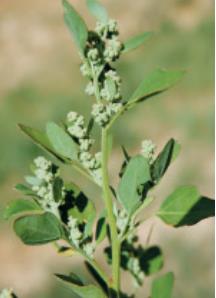 一年生草本,高10-40cm。茎直立或从基部分枝而外倾或平卧,淡褐绿色或黄绿色,具条棱。叶片长圆形、卵状长圆形或披针形,长1-4cm,宽3-18mm,顶端急尖或钝,基部渐狭至柄,边缘具缺刻状齿,表面绿色,平滑无粉,背面密被粉而呈灰白色,有时边缘常带紫红色,中脉显著,黄绿色,侧脉不显,叶柄长为叶片1/3-1/2。穗状圆锥花序,花两性;花被裂片4-3,浅绿色有时边缘带紫红色,通常无粉,长圆形或狭倒卵形,长不足1mm,顶端钝,边缘膜质,雄蕊1-2,花丝短,花药球形,柱头2,极短。胞果球形,顶部外露,果皮膜质。种子扁球形,红褐色或暗褐色,直径0.8-1mm,有细点纹。花果期6-10月。