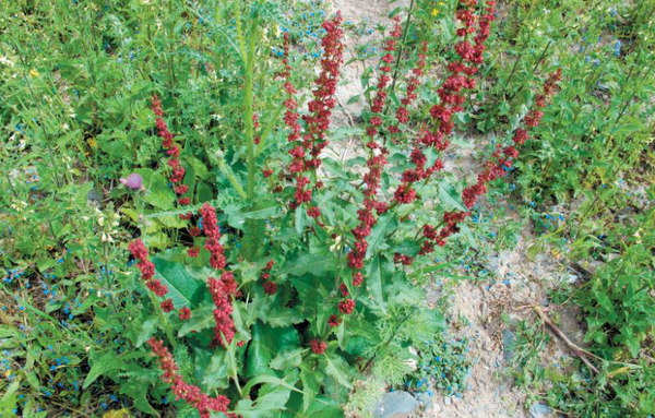 多年生草本,高0.6-1.5m。根圆锥状,肥厚。茎分枝或不分枝,有纵沟槽,疏具白色腺点,节部有短毛,中空。基生叶具柄,叶片长圆状卵形或尖卵形,长10-20cm,宽5-10cm,顶端钝或尖,边微波状,基部心形,背面脉上疏具小突起。花序圆锥状,顶生,大型,分枝少,有叶,花两性,轮生或簇生于花序枝节部或叶腋;花梗纤细,长3-5mm,中部以下有关节,花被片6,紫红色,外轮花被片长圆形,长1-1.5mm,内轮花被片卵形或长圆形,果期增大,直立,长约4mm,顶端钝,基部近截形,边缘具7-11对钩状刺齿,花期刺齿较直,中脉基部常有疣状突起。瘦果卵状三棱形,深褐色,有光泽,长约3mm。花期6-7月,果期8-10月。