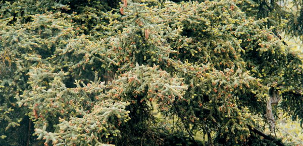 常绿乔木,小枝有木钉状叶枕,多少有毛或几无毛,间或有白粉;一年生枝淡黄绿色,二至三年生枝常呈粉红色;小枝基部宿存芽鳞的先端常反曲;芽圆锥形。叶在枝上螺旋状着生,枝条下面和两侧的叶向上伸展,锥形,长1.2-2.2cm,粗2-2.5mm,先端钝,横切面四方形,四面有粉白色气孔线。球果单生侧枝顶端,下垂,圆柱形或矩圆状圆柱形,幼果紫红色,熟前种鳞背部变绿,上部边缘仍呈紫红色,熟后褐色,长7-11cm;种鳞倒卵形,先端圆,腹面有2粒上端有翅的种子;苞鳞短小,种翅倒卵形,膜质,淡褐色。