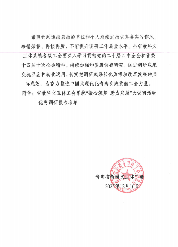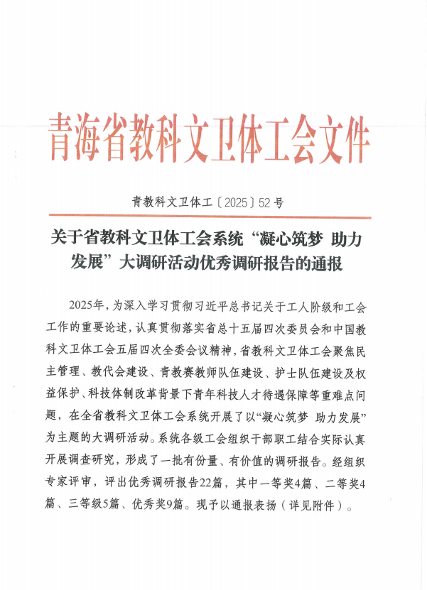 为深入学习贯彻习近平总书记关于工人阶级和工会工作的重要论述,认真贯彻落实省总十五届四次委员会和中国教科文卫体工会五届四次全委会议精神,中国科学院西北高原生物研究所(以下简称“西北高原所”)积极响应,参加了青海省教科文卫体工会系统“凝心筑梦 助力发展”大调研活动,提交优质的调研报告。