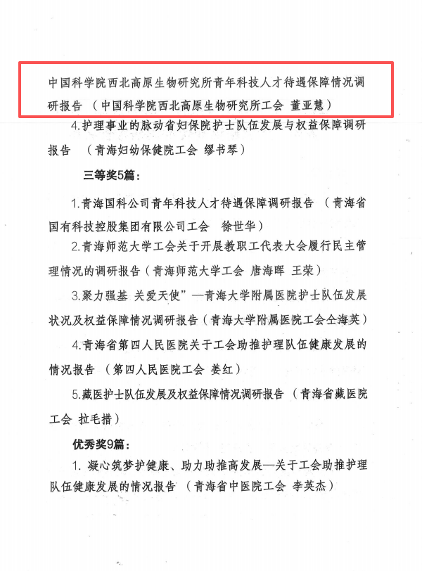经青海省教科文卫体工会组织专家评审,共评出优秀调研报告22篇,由西北高原所人事教育处人事人才主管董亚慧撰写的《青年科技人才待遇保障情况调研报告》喜获二等奖。
