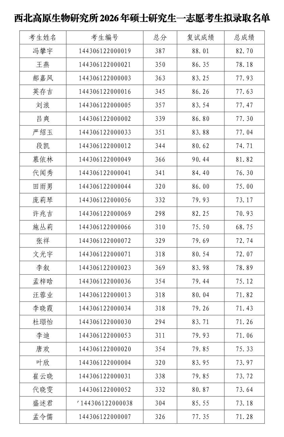 中国科学院西北高原生物研究所2026年硕士研究生一志愿考生拟录取名单